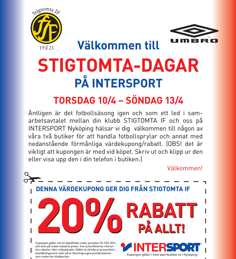 Från och med torsdagen den 10:e april till söndagen den 13:e är det sko-weekend för Stigtomta IFs medlemmar på Intersports butiker i Nyköping. 20% rabatt på allt! Skriv ut kupongen eller visa upp i telefonen.