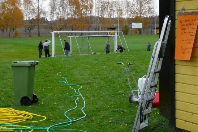 I härligt höstväder genomförde Stigtomta IF lördagen den 18/10 -08 en arbetsdag där fotbollsplanerna inkl. målen gjordes i ordning inför den kommande vintern. Många ställde upp och jobbade denna dag, och ett särskilt tack riktas till Björn Karlsson som började tidigt på morgonen med att flytta alla målen från Tängsta IP till Stigtomta IP. (Han såg även till att gräva ner fundament till bommarna som sitter i anslutning till grusplanen vid Stigtomta IP m.m.) Efter städning och ihop-plockning av allt material bjöds alla inblandade på fika samt korv med bröd uppe på Loftet. Parallellt med arbetet utomhus genomförde styrelseledamoten Henrik Ericsson materialinventering för alla fotbollslag i föreningen. Matchställ räknades och kontrollerades inför kommande säsong. /Lasse J