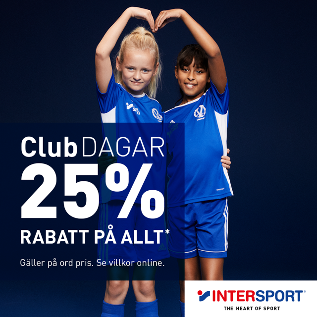 Mellan den 23/9 - 2/10 har vår samarbetspartner Intersport 25% på allt i butik och på intersport.se, ett perfekt läge att köpa det ni behöver för höstens alla aktiva dagar. När du handlar på Intersport är du samtidigt med och stöttar vår förening. För du har väl valt att stötta vår förening lite extra under ”Mina sidor”? Detta gäller för dig som redan är eller blir Clubmedlem hos Intersport. /Styrelsen