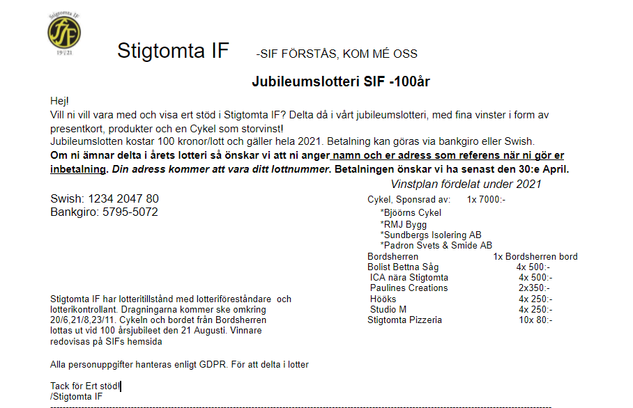 Var med och delta i Stigtomta IFs Jubileumslotteri!