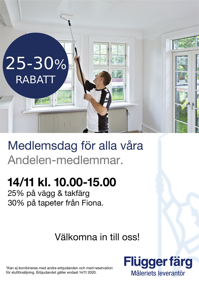 Flügger Färg bjuder in alla medlemmar i Stigtomta IF till medlemsdag lördag 14 november. Du som medlem i SIF får då 25 % på vägg- och takfärg samt 30 % på tapeter från Fiona. Ange att du är medlem i SIF i kassan. Så börja planera för en höst och vinter med uppgradering av tak och väggar inomhus! Behöver ni hjälp med renoveringen kan vi varmt rekommendera någon av föreningens partners. Ni hittar alla i menyraden och under Sponsorer.