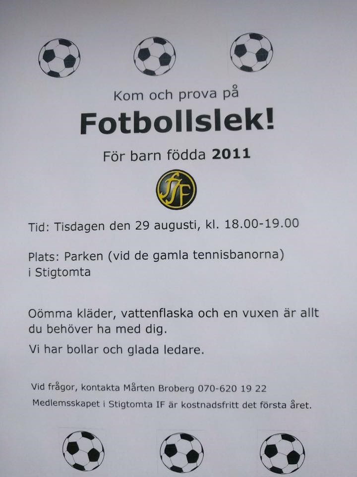 Kom och prova på Fotbollslek! - För barn födda 2011 Tid: Tisdagen den 29 augusti, kl 18.00-19.00 Plats: Parken (vid de gamla tennisbanorna) Se bilden för mer info samt kontaktuppgifter. JW