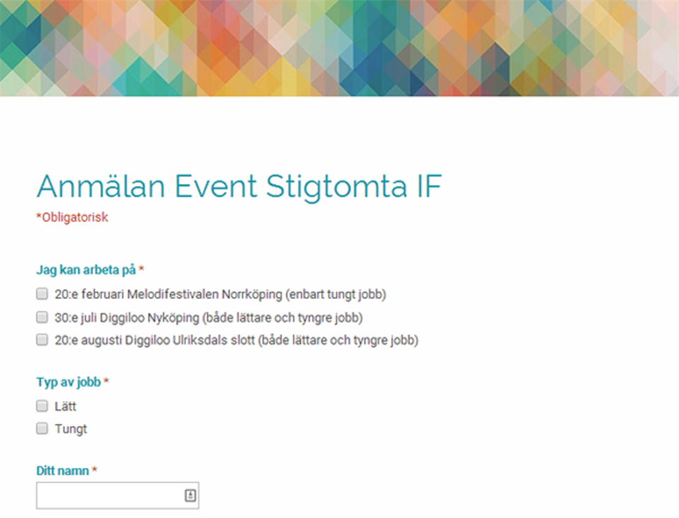 Missa inte att anmäla er till de event under 2016 som redan är inplanerade. Först ut är Melodifestivalen i Norrköping och sedan i sommar är det Diggiloo både i Nyköping och Ulriksdal. Alla event är viktiga inkomster till Stigtomta IF som i förlängningen leder till att vi förhoppningsvis även i fortsättningen kan ha låga medlemsavgifter. Anmäler er gör ni på: https://goo.gl/2zCpb0 JP