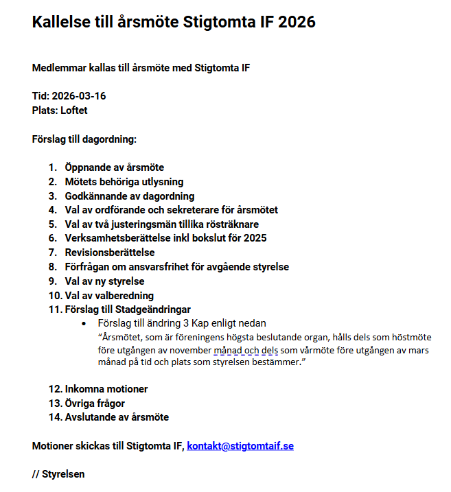 Klicka på bekräftelselänken i det mejl vi skickat dig för att börja ta emot uppdateringar från Stigtomta IF.