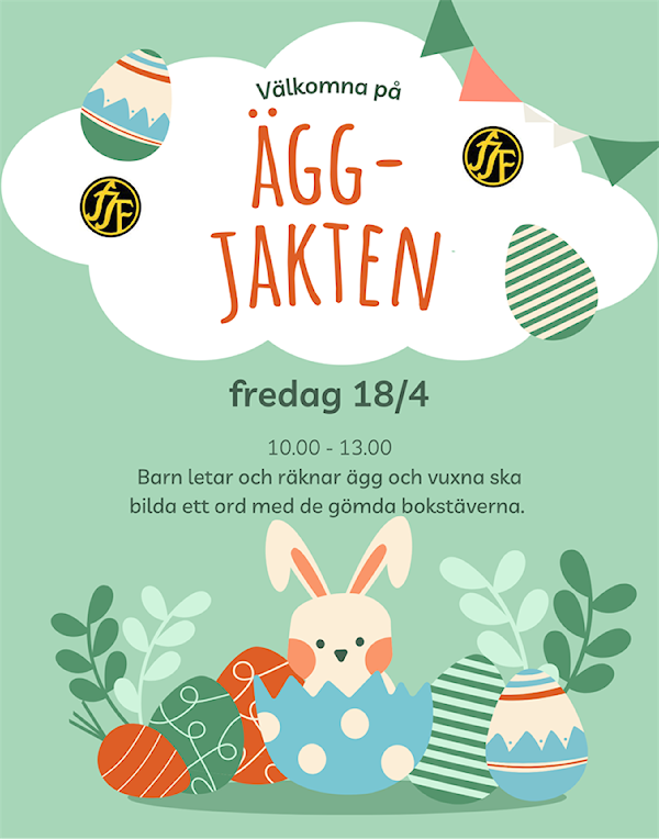 Äggjakten arrangeras långfredagen 18/4 mellan klockan 10:00-13:00 med utgångspunkt från Loftet. Från Loftet går man gångvägen mot Bråvallavägen och följ den till Elvägen. Där svänger man vänster och korsar sedan Bärbovägen och fortsätter mot Ristippen och följer sedan stigen vidare mot OK hällens klubbstuga. Man passerar parkeringen vid OK Hällen och korsar Bärbovägen igen och följer stigen genom skogen och ut på skolvägen, följ sedan Skolvägen tillbaka till Loftet.