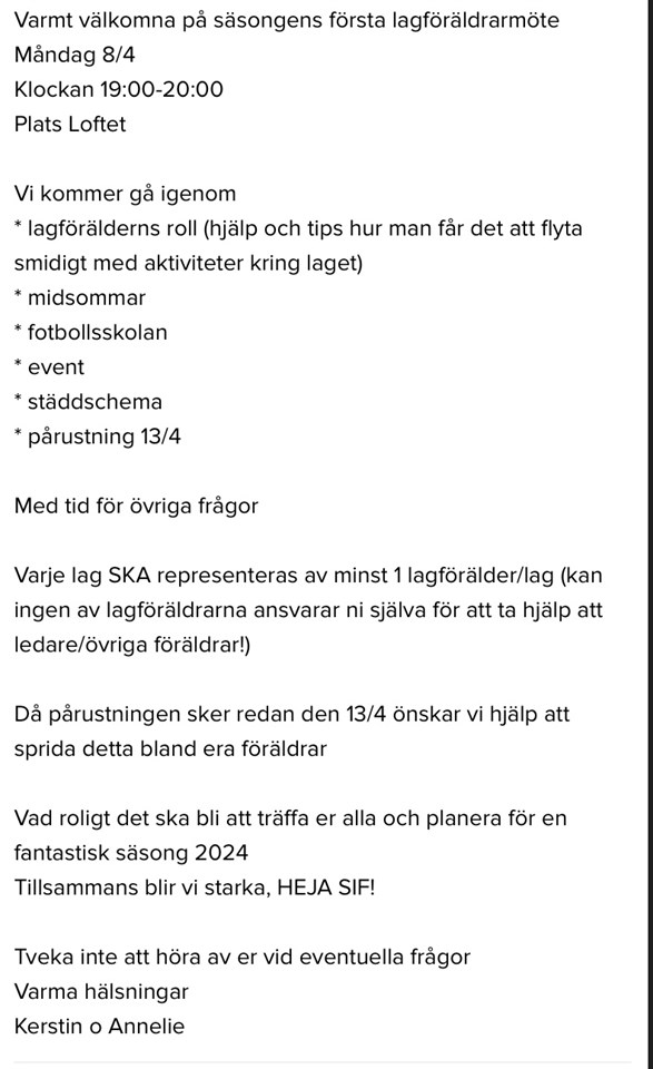 Hej! Kul att vi var så många på träningen i söndags. Det märks att barnen börjar känna sig trygga både i gruppen och kring aktiviteten. Vi skulle vilja börja med att be både vårdnadshavare och syskon som stannar kvar under träningen att antingen vänta i omklädningsrum, utomhus eller att sitta på en bänk men att respektera vår önskan om lågmälda samtal. Vi tar gärna mot hjälp under aktiviteter, om detta förmedlats av oss. Påminnelse om att det inte är någon träning nu på söndag, den 3 mars. Söndagen därefter, den 10 mars är det träning som vanligt igen. Två av våra tränare är frånvarande detta tillfälle, och vi undrar om det finns någon vårdnadshavare som kan tänka sig att hjälpa till. Kommentera gärna nedan isåfall. Hälsningar Tränarna