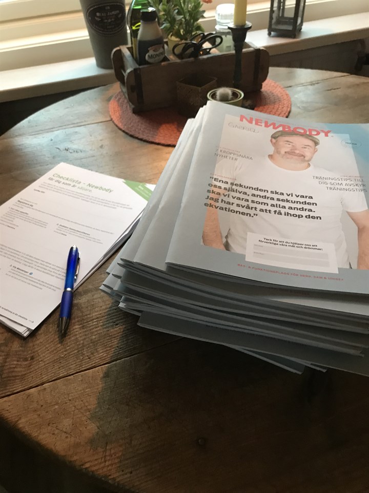 Nu har katalogerna kommit. Gabriel tar med och delar ut dem på morgondagens träning.